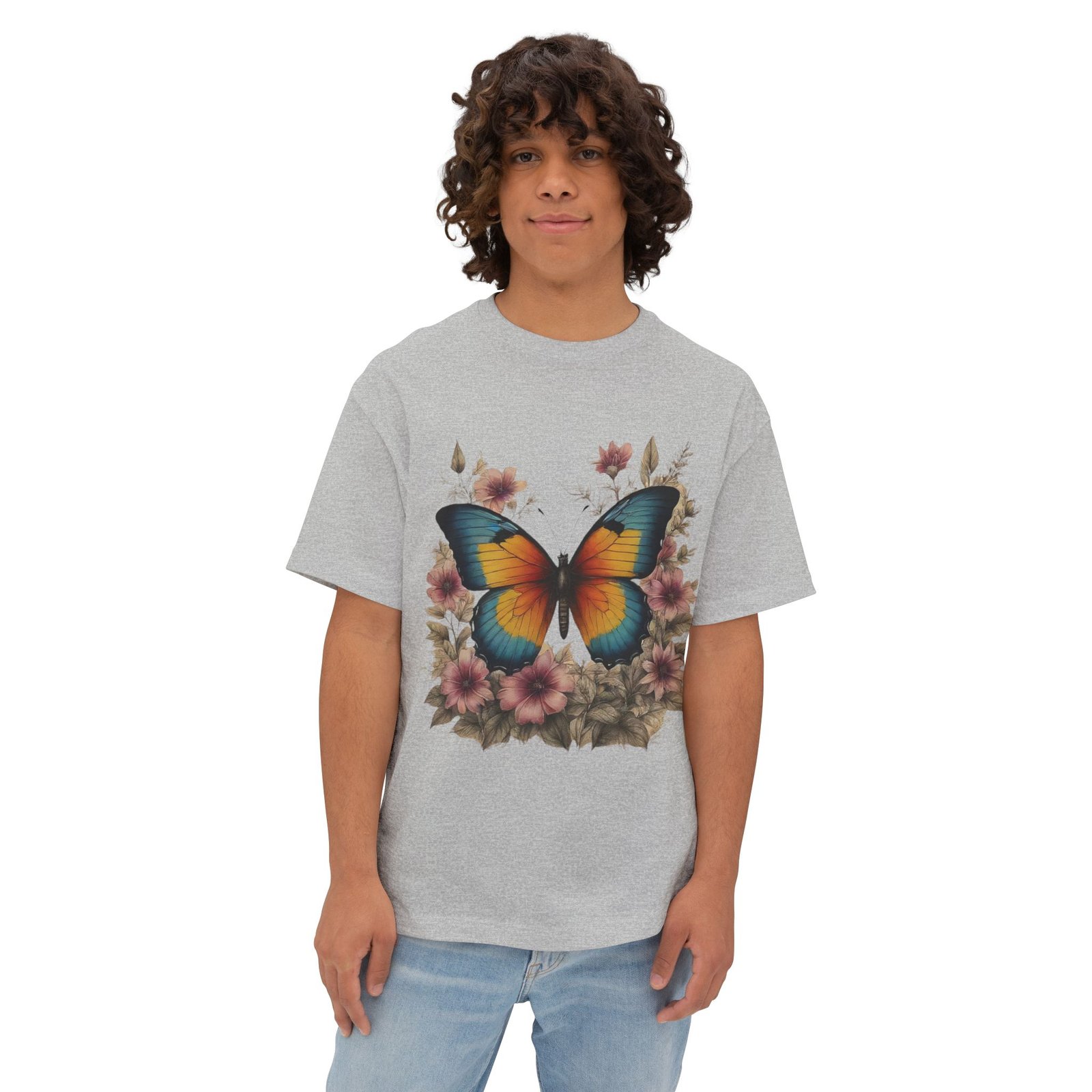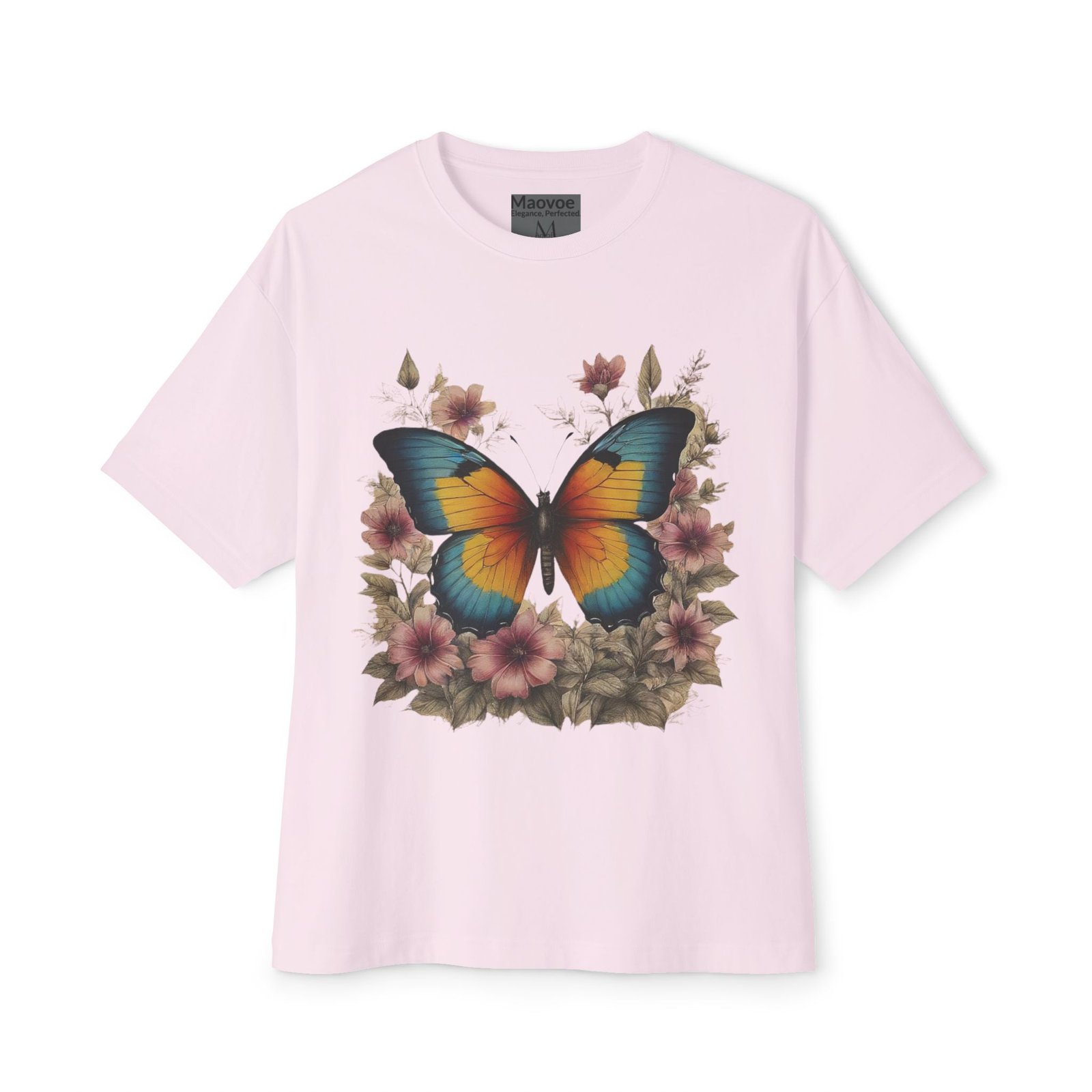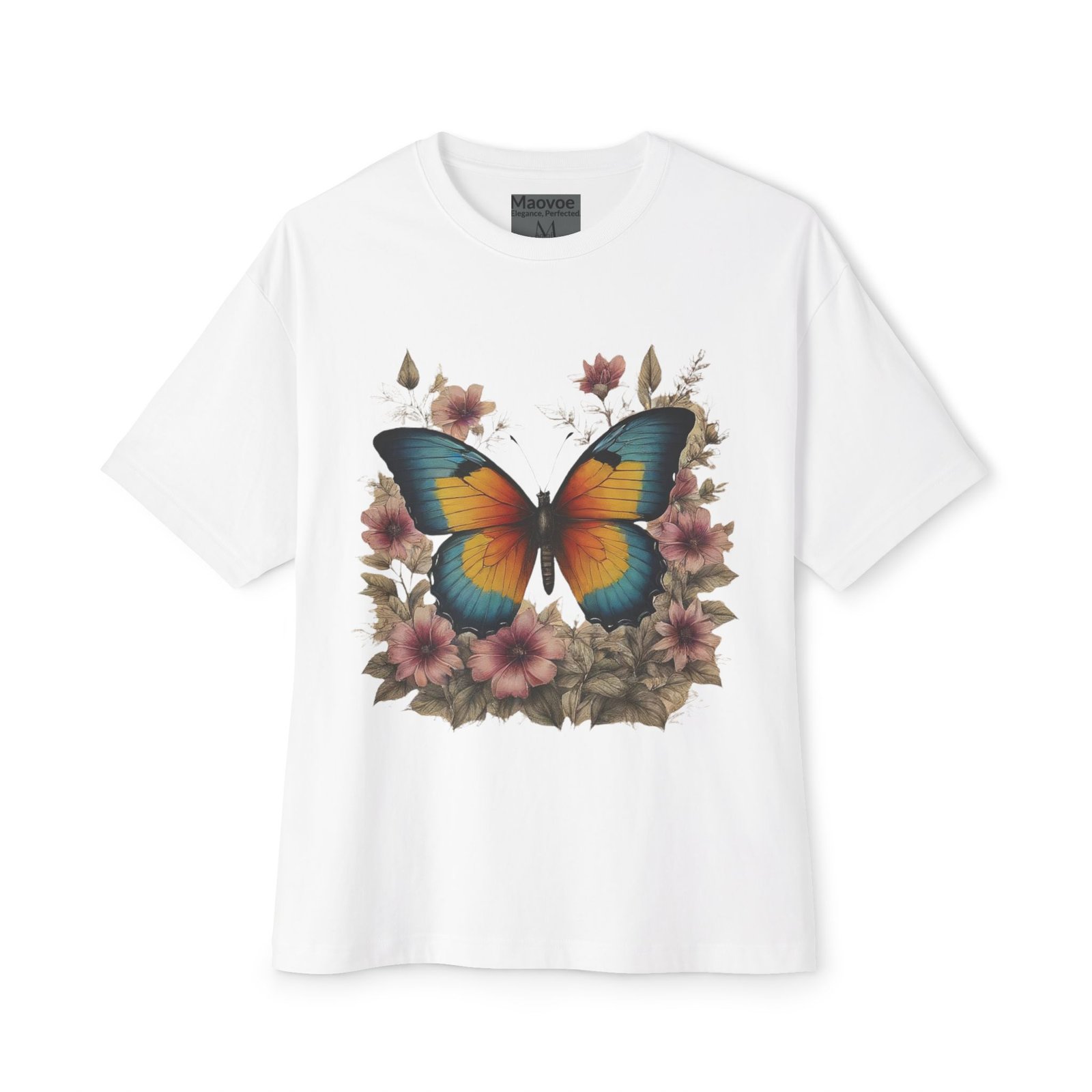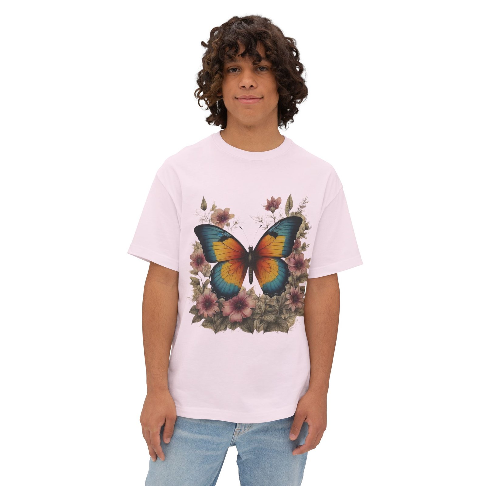 Step into a storybook garden with the Enchanted Butterfly Floral Tee. A vivid blue-orange butterfly rests among blush flowers and forest foliage, captured in high-contrast color on our relaxed, oversized boxy shirt. Crafted for nature lovers and bold-style seekers alike, this tee transforms casual outfits into eye-catching statements—perfect for picnics, festivals, or sunny weekend strolls.