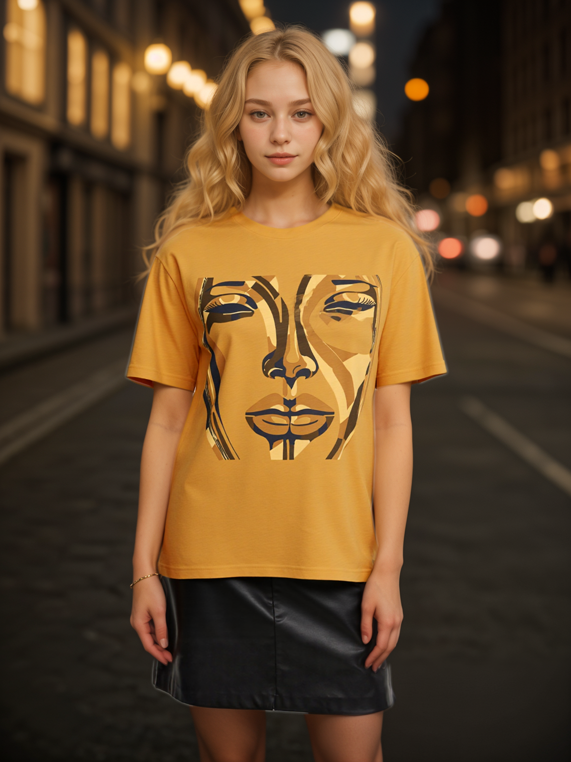 • Artistic Design: Features a bold golden abstract face print for a luxurious, statement-making look.